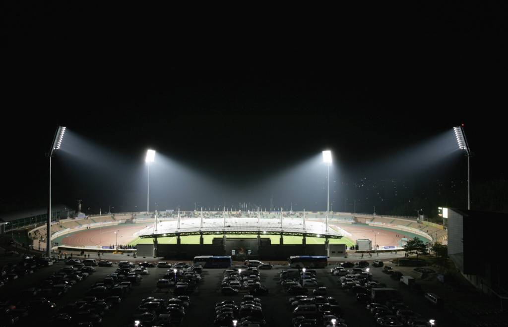 Поля для игры в футбол освещают металлогалогенными прожекторами повышенной мощности (1000-2000Вт). Светодиодное оборудование на таких объектах не устанавливается из-за несоответствия техническим требованиям к освещению. Если на поле отсутствуют легкоатлетические зоны, то предпочтительнее использовать прожектора симметричного и асимметричного распределения светового потока, 4-х или 6-ти опорные. Высота опор, размещают по длине футбольного поля 12-25 м. Осветительное оборудование должно иметь два положения: режим «соревнования» и «тренировка».