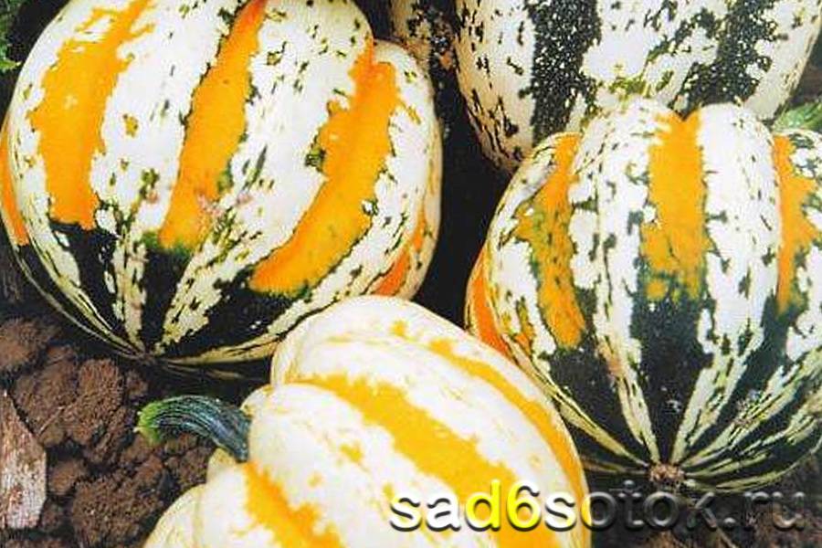 Красивые разноцветные кабачки больше похожи на небольшие тыквы, поспевают на 50–55 сутки, семена высевают в грунт в первой декаде мая. Кусты раскидистые, высаживают на расстоянии 70–80 см. Плоды чалмовидные, ребристые, весом 0,6–1,0 кг. Кожица плотная, гладкая, покрыта разноцветными полосами – белого, черного или оранжевого цвета. Оранжево-золотистая мякоть отменного вкуса – сладкая, богата каротином, мелковолокнистая. Урожайность до 60 кг с 10 кв. м, кабачки хранятся до 5 месяцев, не утрачивая товарного вида и вкусовых свойств, при этом структура мякоти со временем становится еще более нежной.