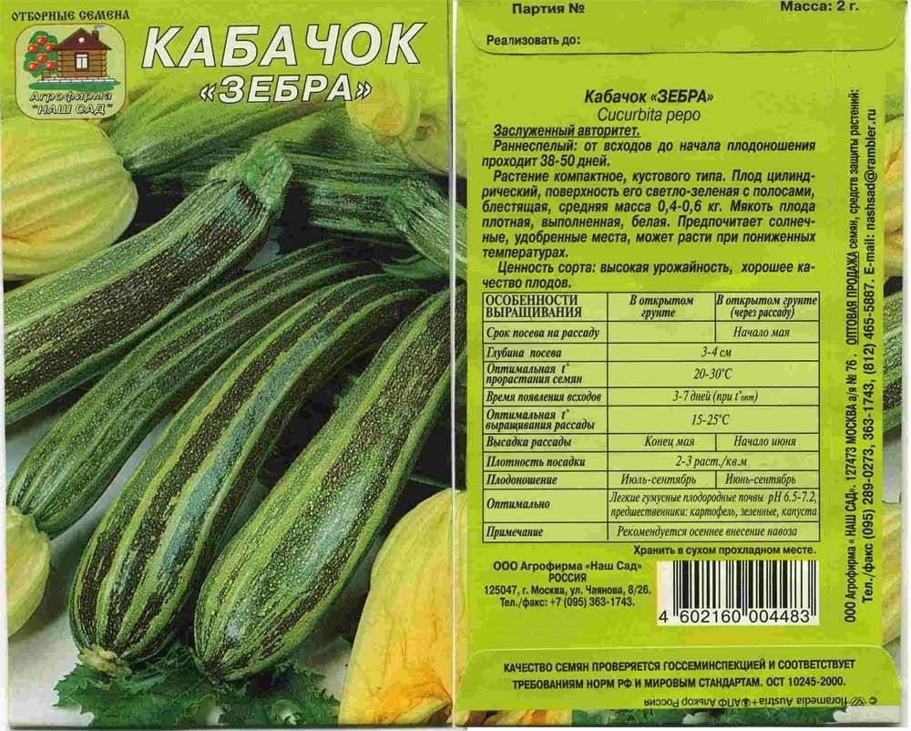 Этот сорт получил свое название за счет окраса кожуры зрелого плода. Кабачки окрашены в светло-зеленый цвет, но по всей поверхности плода хорошо заметны темно-зеленые полосы. Сорт считается ранним, урожайным, не прихотливым к условиям произрастания. Средняя масса плодов — 800-900 грамм. Зебра очень хорошо хранится без потери вкусовых качеств, некоторые плоды сохраняются до марта месяца.