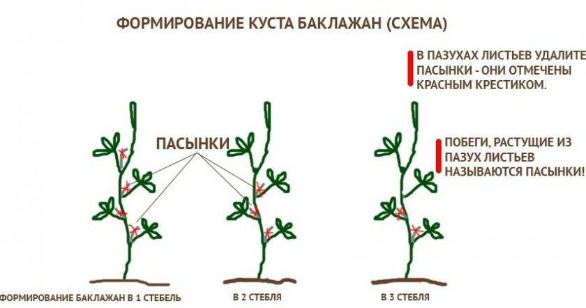 Существует несколько схем для формирования кустов баклажанов. Их отличие заключается в количестве стеблей, растущих от вершины основного стебля. Их может быть от одного до трёх штук. Для каждого куста подбирается своя схема формировки.