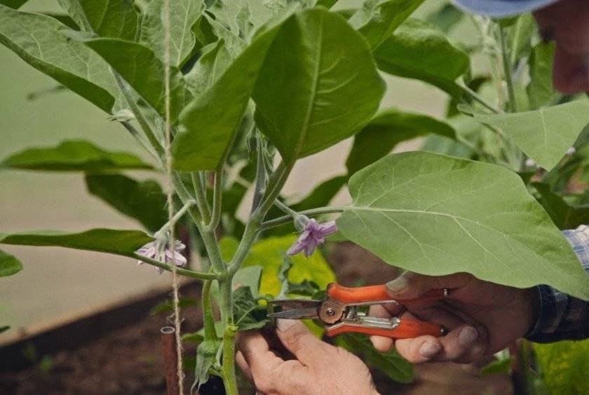 Кусты баклажанов в открытом грунте формируют на 10-15 день после посадки рассады. Пасынки, побеги, листья и завязи нужно удалять вручную. Верхушки высокорослых растений нужно прищипывать при достижении роста в 35 сантиметров.