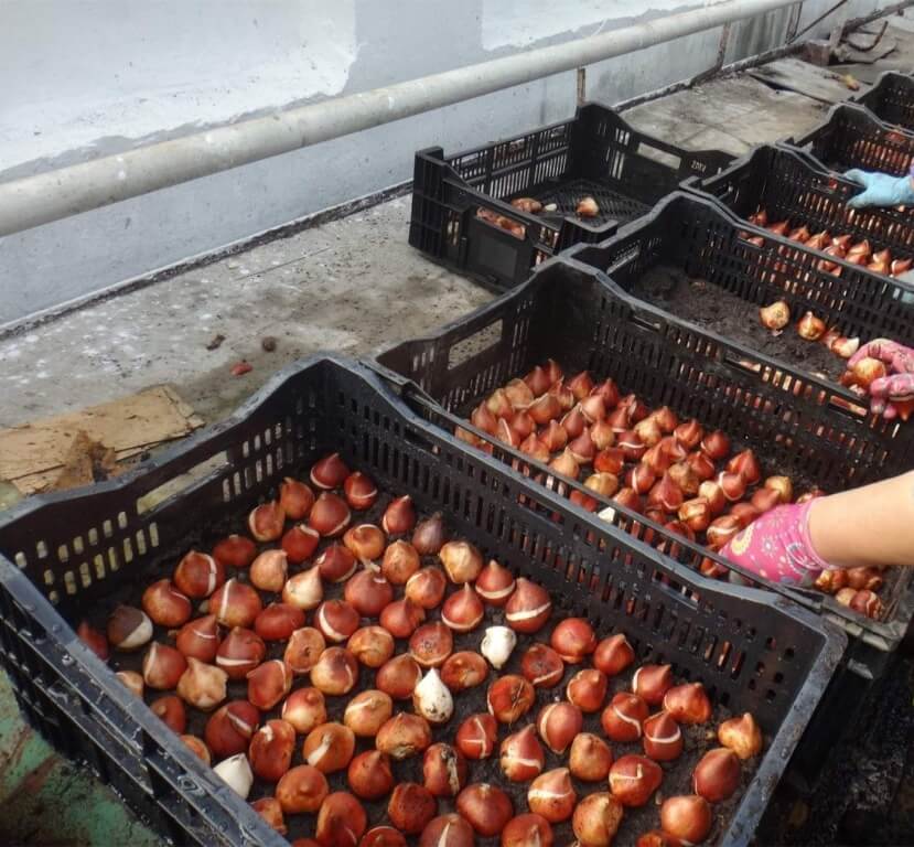 Отсортированный материал выкладывают в тару одним или двумя слоями. В течение ближайших двух месяцев в луковицах происходят процессы формирования бутонов и листьев, поэтому посадочному материалу следует обеспечить оптимальные условия.