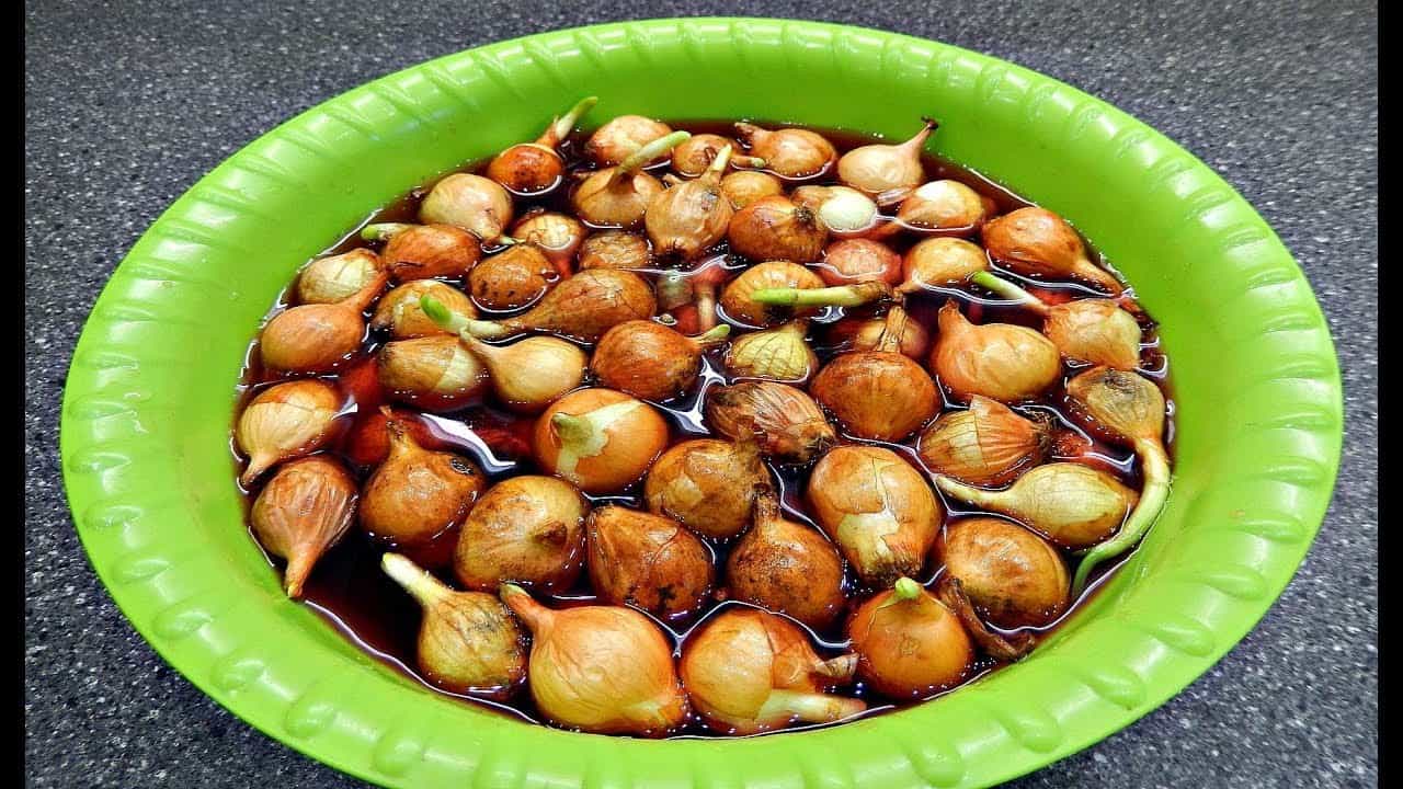 Когда хозяин не может сделать просушку, он поступает по-другому. Наливает в посуду горячую воду бросает туда луковички и оставляет их там на 2 мин. Воду сливает и заливает холодной, выдерживая их там ещё 60 с., сливает жидкость.