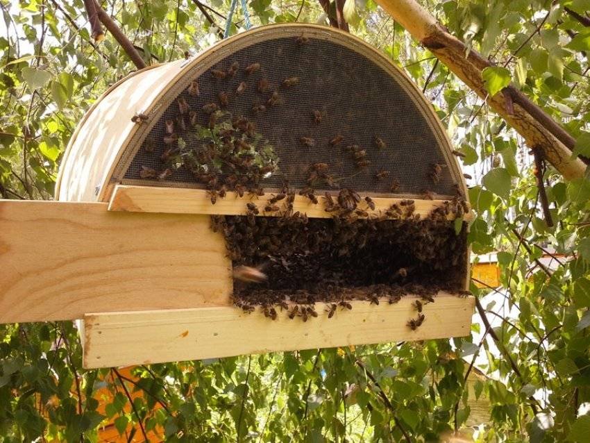 Если рой влетел в ловушку, то после заката нужно прикрыть леток, а затем осторожно перенести насекомых на пасеку.
