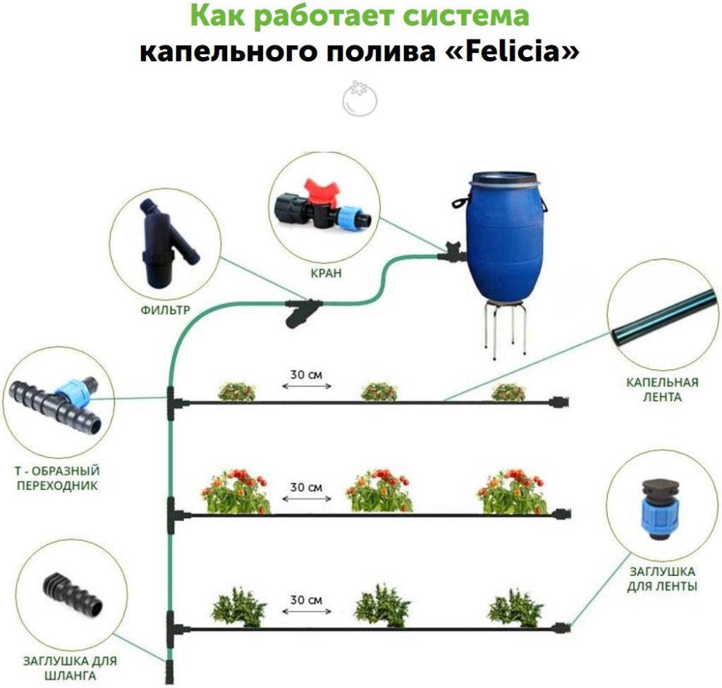 Принцип капельного полива – система трубок, к которой с помощью тройников присоединены более тонкие трубки с капельницами. По которым маленькими порциями точечно под каждый куст подаётся вода.