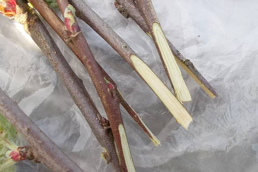 Подмёрзшие, проросшие, высохшие или заплесневевшие ветви для прививки не годятся, поэтому стоит заготовить черенки с запасом. Можно воспользоваться и ветками, нарезанными ранней весной, до начала сокодвижения.