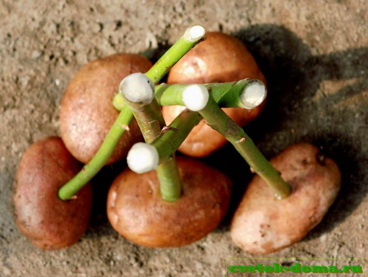 Следующий способ очень необычный – вы можете вырастить черенок в картофелине. Такой способ позволяет создать лучшие условия для взращивания черенка. Так как клубень содержит все полезные вещества. К тому же, это достаточно простой способ.
