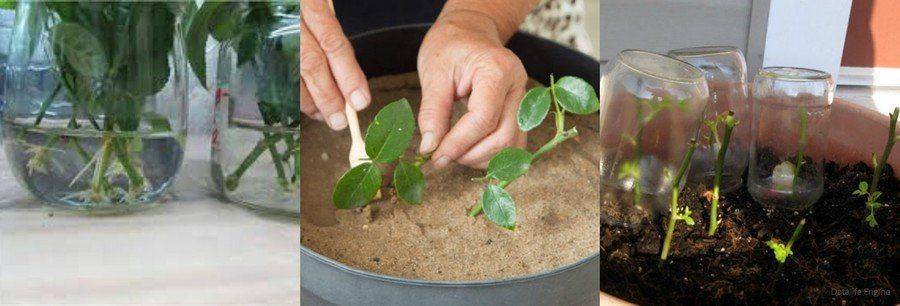 Черенок высаживают под наклоном, оставляя над поверхностью почку, а сразу в грунте – еще одну. Емкость накрывают прозрачным пакетом или над черенком, плотно прижимая к почве, устанавливают стеклянную банку. Постоянно следят за влажностью почвы. О том, что роза укоренилась, можно будет судить по росткам