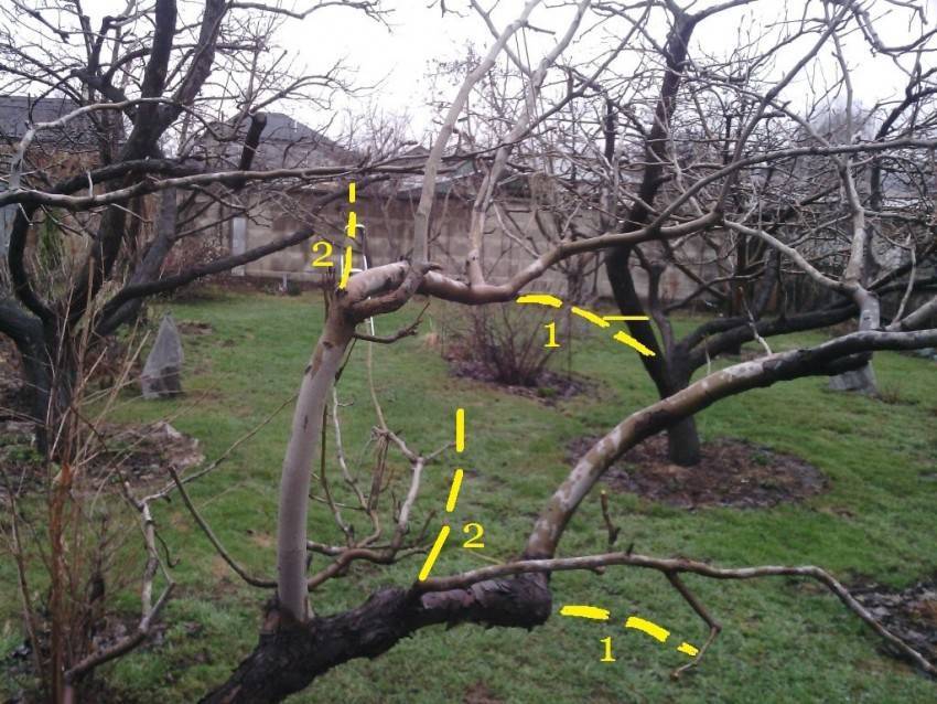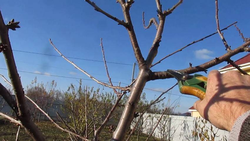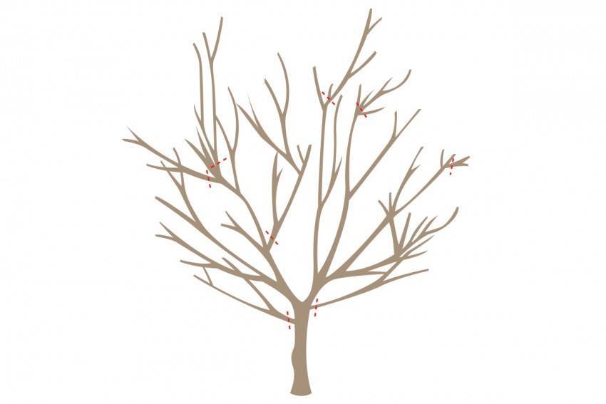 Если дерево уже начало стабильно плодоносить, крону прореживают, убирая все неудачно расположенные побеги, загущающие её. В основном они растут вглубь и вниз. Ни в коем случае не срезайте самые кончики ветвей и не трогайте ростовые почки.