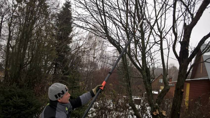 Когда-то давно я привязывал ножовку по дереву к длинному шесту и таким простым приспособлением прямо с земли срезал высокорасположенную ветку. Она падала. А иногда и цеплялась в вершине за соседние ветки. Приходилось это все как-то разъединять.