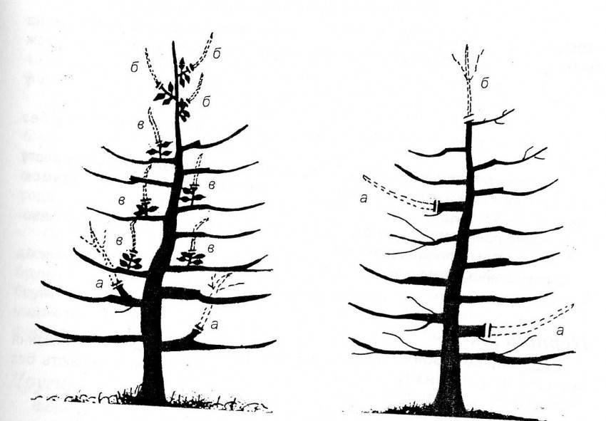 На втором и третьем ярусе побеги удлинения скелетных ветвей укорачивают до 70–80 см. Если они не достигли такой длины, то их не обрезают. Побеги, растущие на скелетных ветвях вертикально вверх или внутрь кроны, удаляют, боковые, растущие в сторону периферии, – обрезают, оставляя 70 см, или не обрезают, если они короче 70-ти см.