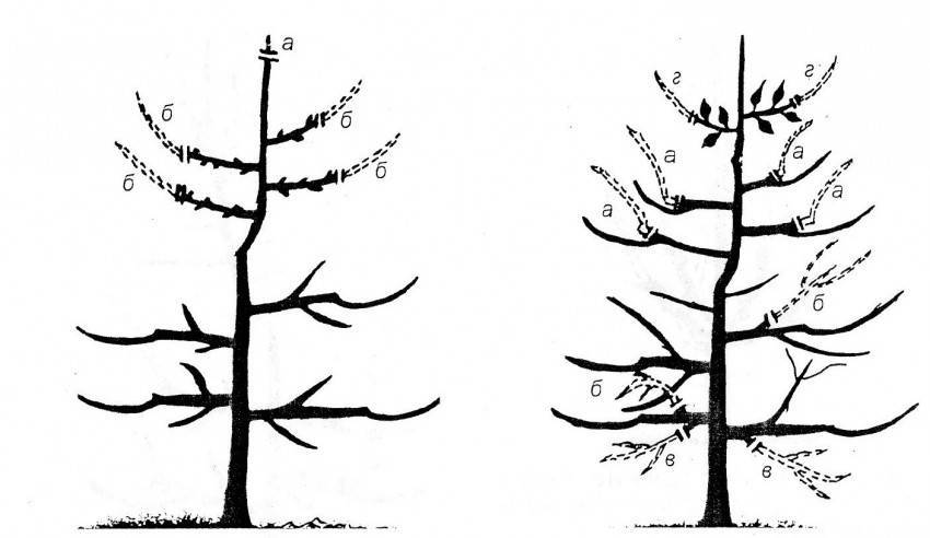 Из выросших боковых побегов выбирают 3–4 ветви для формирования первого яруса. Самый нижний побег укорачивают до 50–60 см, а остальные срезают на его уровне. Далее на центральном проводнике от верхней ветки первого яруса отмеряют 60–70 см, отсчитывают 4 почки и обрезают.
