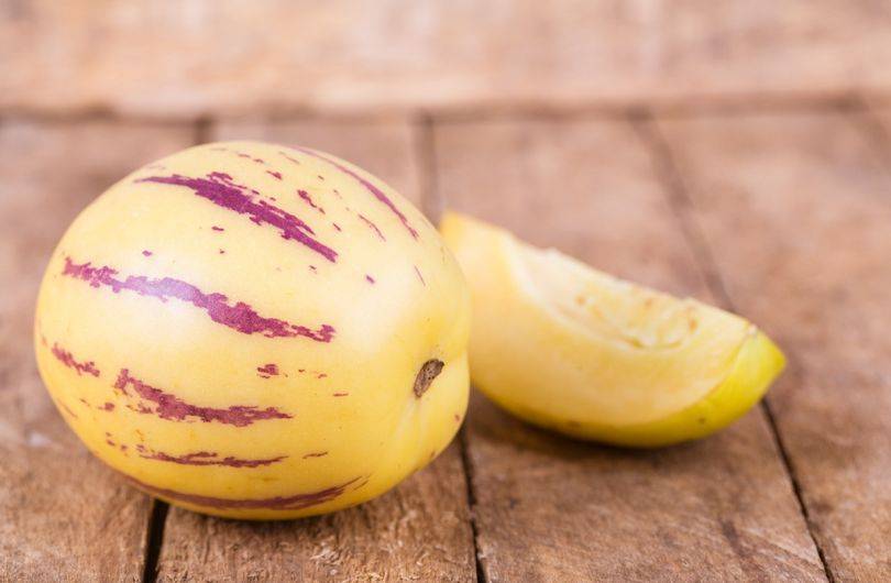 - Дынная груша Пепино хорошо зарекомендовала себя при культивировании на территории Подмосковья по большей части в тепличных или даже домашних условиях. Растение довольно долго пребывает на стадии вегетации и цветения, но после длительного ожидания образуются плоды разнообразных форм с желтой или оранжевой кожурой, украшенной фиолетовыми полосами. Мякоть плотная, мясистая, тающая во рту.