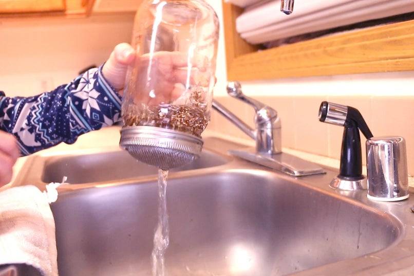 Положите банку вверх дном под углом на держатель для прорастающих банок или внутрь чаши, чтобы оставшаяся вода могла стечь. В течение этого времени продолжайте держать банку в слегка теплом, но в основном темном месте.