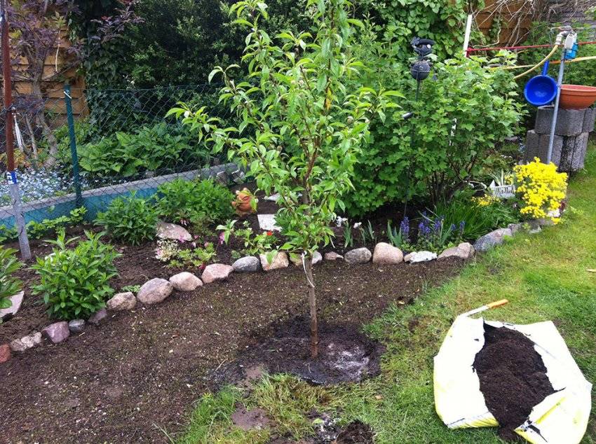 Для посадки саженца нужно вырыть яму размерами 50х60 сантиметров. Выбранный грунт нужно смешать с 5 килограммами перегноя, торфом, песком, добавить по 100 грамм суперфосфата и сульфата калия, 300 грамм древесной золы и немного извести.