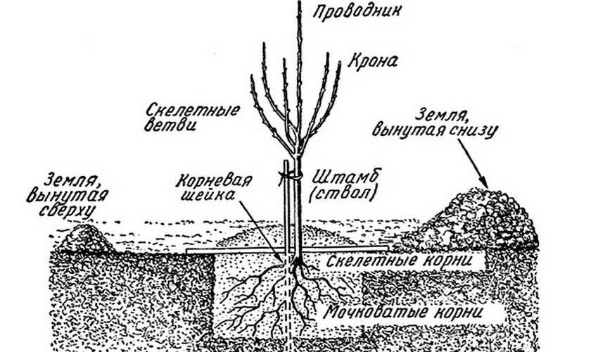 Чтобы заполнить яму, понадобится два ведра навоза, 2 ведра песка, 30 граммов суперфосфата и 20 граммов сульфата калия. Все компоненты смешиваются и высыпаются на подготовленный участок. Из землесмеси надо сформировать холм, на котором и следует разместить саженец. Корни молодого дерева необходимо разровнять по всей поверхности. Регулируя высоту посадки, надо стараться, чтобы корневая шейка была на 5 сантиметров выше уровня почвы