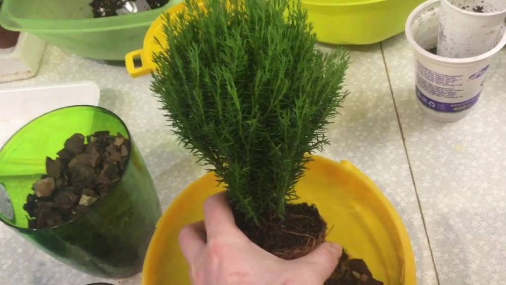 Чтобы пересадить тую из контейнера, нужно увлажнить растение и аккуратно вытащить его из горшка, не трогая корневую систему. Посадка саженцев осуществляется на расстоянии 25 см друг от друга, с обязательным поливом земли.