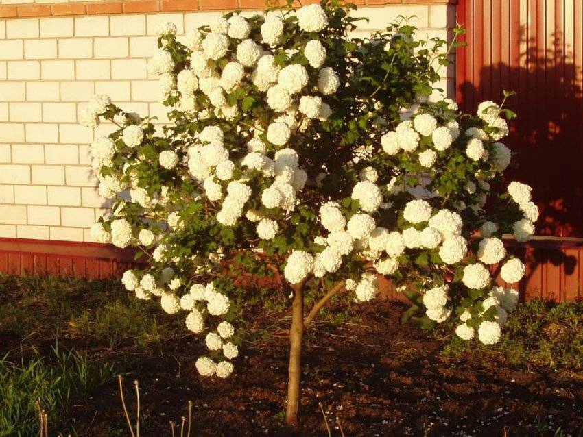 Если цель — декорировать высокий забор, то калина замечательно с этим справится. Обрезку и моделирование кустарник переносит хорошо, принимая нужную форму. Вдоль забора бульденеж можно посадить кустом или отдельным деревцем. Штамбовая крона требует большего внимания, начинать нужно с молодого кустарника. Тогда это пройдет безболезненно и не повлияет на декоративность.