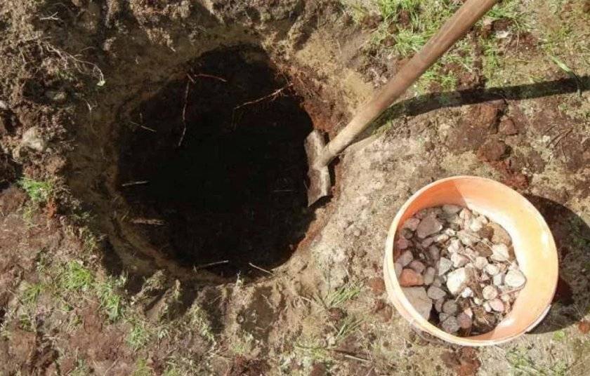 Шаг 2. В посадочную яму насыпают дренаж: мелкий щебень, керамзит или кусочки древесной коры. Это необходимо, чтобы в яме не скапливалась вода, поскольку даже кратковременное застой воды у корней растение плохо переносит.
