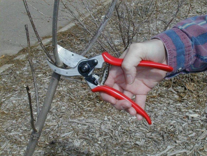 - Пересаженное растение нужно обрезать. При осенней посадке эту процедуру можно отложить до весны. Повреждённые, сухие ветви обрезают под корень, а остальные — на 20–25 см выше уровня земли. Такая обрезка поможет омолодить пересаженный куст.