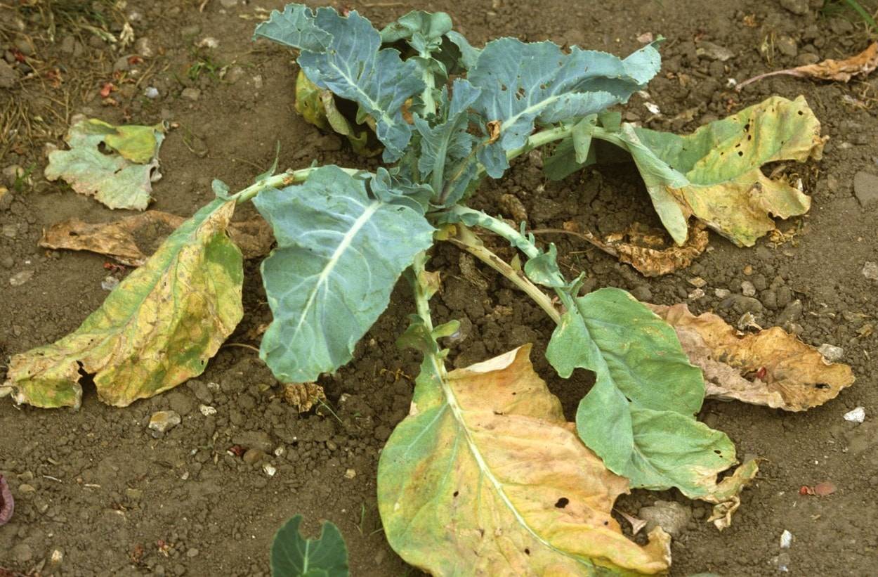 – это когда происходит отмирание краешков на верхних листочках. Данную болезнь переносит капустная муха своими личинками. Сражаться с такой напастью можно с помощью табачной пыли или фосфоритной муки.