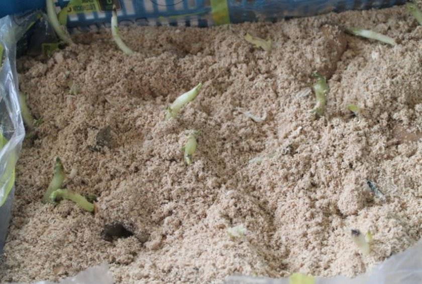 - Во влажном субстрате. Размещают клубни во влажных опилках или торфе, следя за тем, чтобы субстрат не пересыхал. Ростки появляются через 18–20 дней.