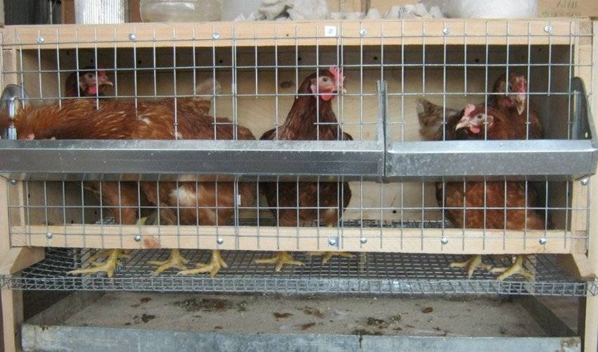 Клетка для содержания кур несушек — это каркас из брусков. Материал брусков — металл или древо. Стены — из металлической ячеистой сетки (все или только одна, где будут кормушки, остальные три стенки могут быть выполнены из другого материала). В каждой клетке также необходим желобок для яиц. Дно клетки должно быть с уклоном, под которым следует разместить выдвижной поддон для помета.