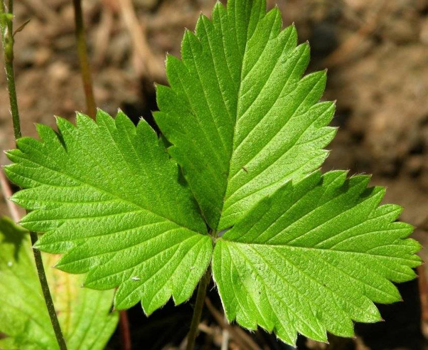 Листовые пластины имеют небольшое опушение в виде прямых волосков. Их края зубчатые, а конец с тупым округлением. Побеги клубники ползучие, укоренение которых происходит в узлах.