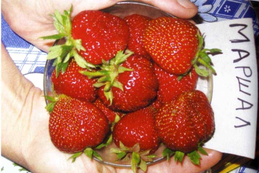 Клубника «Маршал» формирует крупные ягоды ярко-красного цвета. Поверхность ягоды очень привлекательная, с выраженным блеском. Средний вес товарной ягоды может составлять 45−65 г и более. Для полностью вызревшей ягоды характерна конусовидная форма. Спелая мякоть имеет умеренную плотность и сладкий, с незначительной кислинкой вкус.