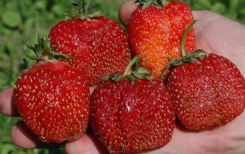 - Ягоды пунцовые, блестящие, держатся на прочной плодоножке, поэтому никогда не «стекают». Плоды могут быть с тупым кончиком, с гребешками или ребрами. Внутренняя часть не имеет пустот, нежно-розовая с незначительными белыми прожилками. Ягоды сладкие с ярко выраженным ароматом.