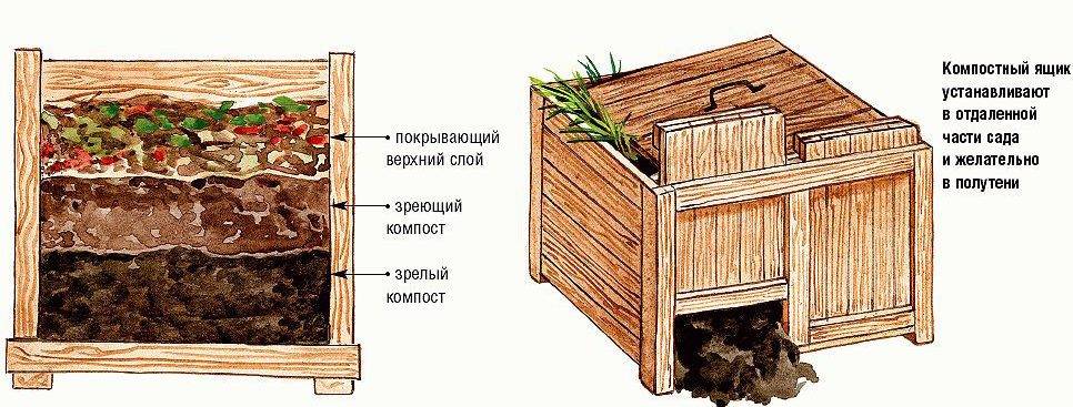 Заметка! Самостоятельно изготовить и установить на садовом участке можно деревянный ящик или компостную яму. Главное — определиться с назначением, обозначить основные требования при производстве.