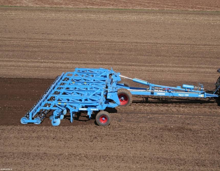 - Лемешная модель внешне напоминает плуг, но оснащена лемехами гораздо меньшего размера и не переворачивает почвенные пласты. В результате удаётся достичь щадящего воздействия на грунт с одновременной разбивкой крупных фрагментов. Орудие характеризуется большой шириной захвата, что позволяет выполнять обработку крупных площадей в короткий срок.