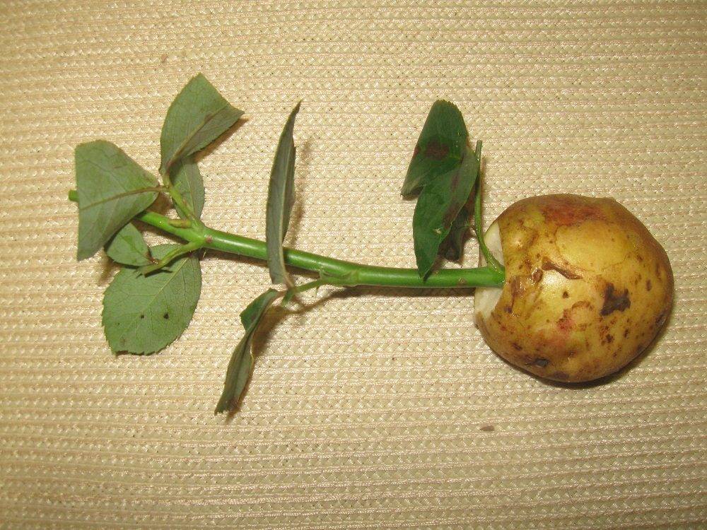 Делайте все тоже самое, что и при черенковании, единственное отличие – черенок держите не в воде, а вставьте его в обычную картошку, а после – сразу закопайте эту «конструкцию» в открытом грунте. Этот способ является одним из самых популярных, т.к. практически не требует усилий, а роза получает достаточно питательных веществ из картошки.