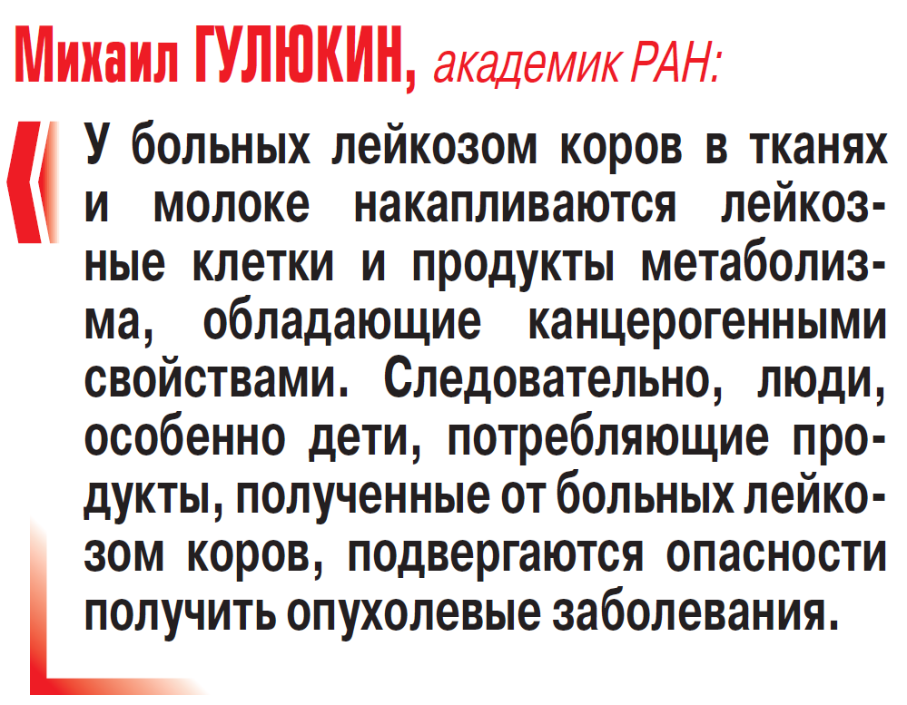 По словам представителя Союзмолока, больные животные не выгодны их хозяевам: лейкоз снижает продуктивность скота и приходится избавляться от дорогих, но больных рогатых. Также в России действует система «Меркурий», позволяющая контролировать сельхозпродукцию на любом этапе ее производства, и в этой системе отмечаются статусы хозяйств по болезням.