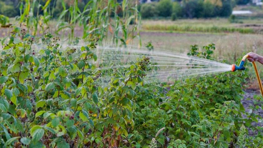 Подкормки вносятся после обильного полива, чтобы не обжечь корни малины. |