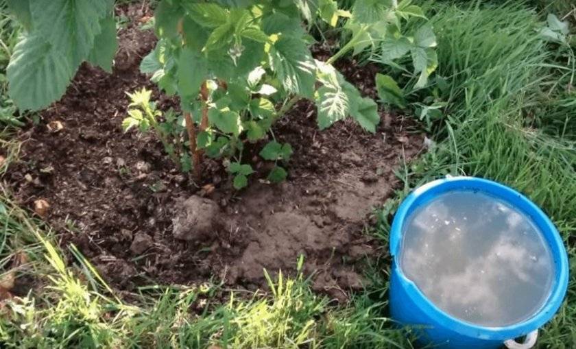 Подкормки вносятся после обильного полива, чтобы не обжечь корни малины. |