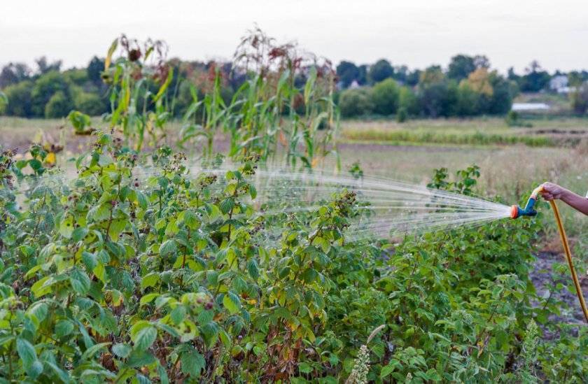 Подкормки вносятся после обильного полива, чтобы не обжечь корни малины. |