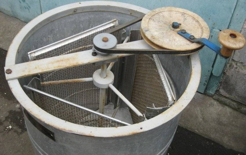 - Ручная. Барабан приводится в движение при помощи рукояти. Из преимуществ отметим относительно низкую стоимость аппарата, возможность использовать в любых условиях, без подключения к электросети; из недостатков — необходимость прикладывать физическую силу для откачки мёда, сложность в контроле интенсивности вращения и продолжительности манипуляций, а также вероятность повреждения сот.