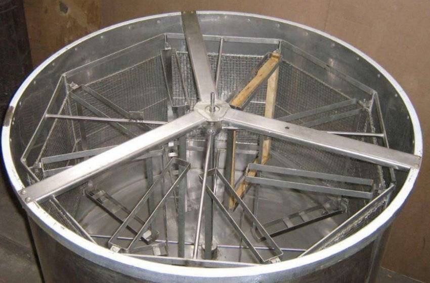 - радиальный — рамки устанавливаются в гнёзда, и можно проводить откачку 36 полурамок (с размерами — 435×145 мм), либо 36 рамок «РУТ» (435×230 мм), либо 18 рамок Дадан (435×300 мм).