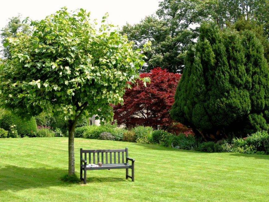 Помимо посадки цветов и кустарников зону под деревьями можно использовать для создания пространства для отдыха и установки беседки. Это особенно удачный вариант в случае посадки хвойных пород, которые не терпят «соседей снизу», а также других деревьев, создающих неблагоприятные условия для прикорневой растительности.