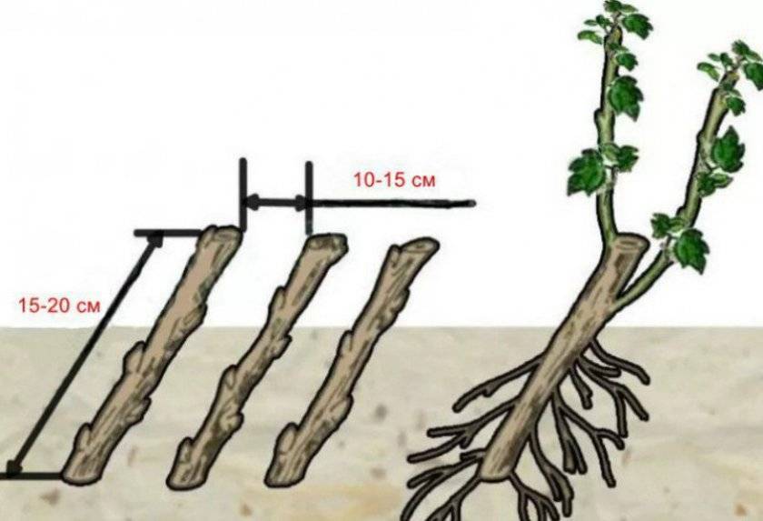 Культуры размножаются двумя способами — черенками (живцами) или отводками. Первый способ применяется чаще, так как позволяет ускорить процедуру выращивания нового куста. Холодной осенью или даже зимой от куста отрезают одеревеневший черенок, на котором должно быть не менее 6 почек. Его прикапывают в грунт под наклоном (как при посадке), аккуратно присыпают грунтом и торфяной мульчей.