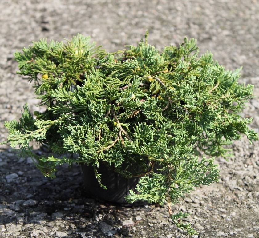 Стелющийся кустарник высотой всего 0,1-0,2 м, с диаметром кроны 2-2,5 м. Веточки гибкие, разветвленные, в естественной среде образуют густое ковровое покрытие. Хвоя зеленая, летом с синеватым, а зимой рыжеватым оттенком. При домашнем культивировании данного можжевельника требуется регулярно проводить формирование кроны.