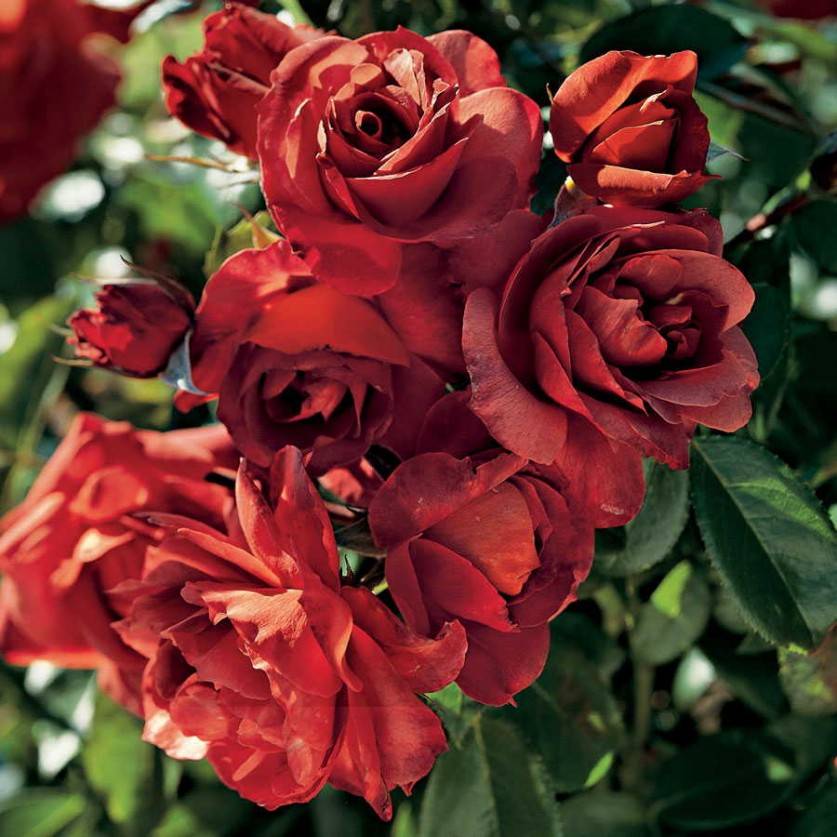 Ещё один интересный сорт – ‘Cinco de Mayo’ (Carruth). Его цвет тоже непросто описать, хотя можно считать близким к терракотовому. При отцветании на лепестках этой розы появляется лёгкая фиолетовая тень. Цветки ароматные, интересной формы, хотя и не отличаются сильной махровостью. Кусты этого сорта цветут обильно и быстро восстанавливаются после сильной обрезки.