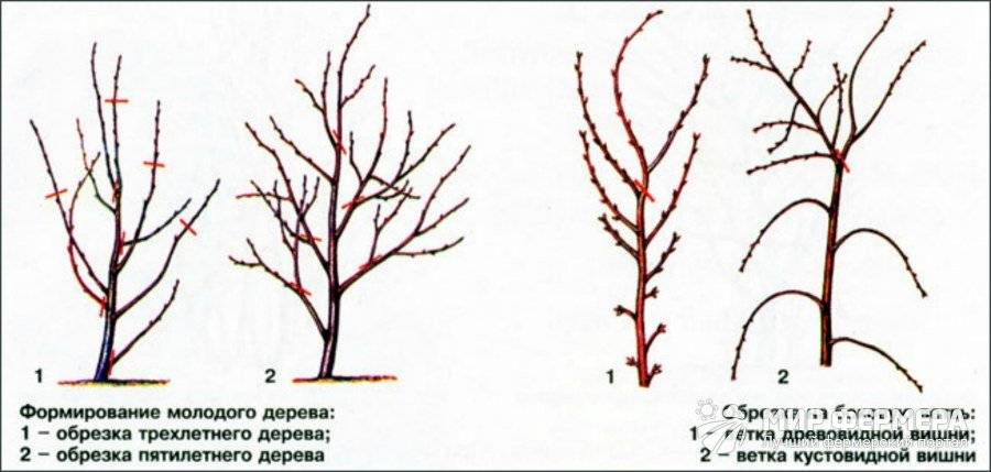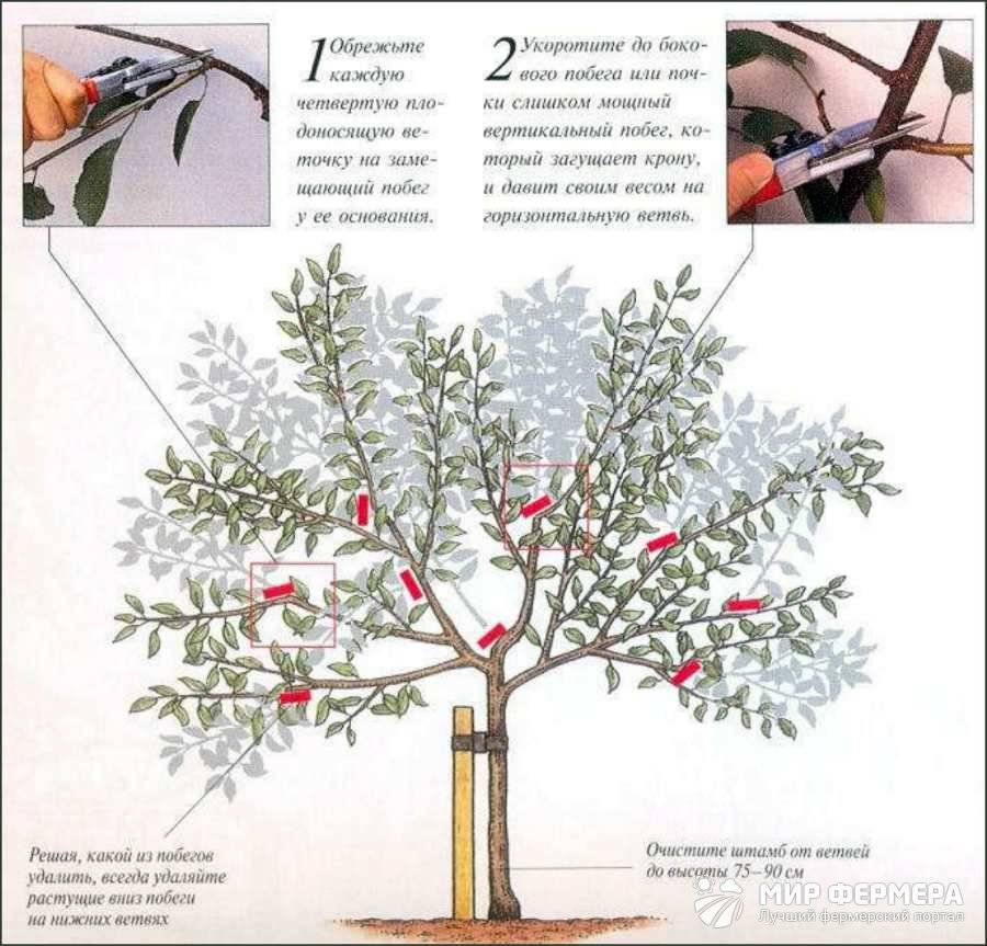 Формирование кроны черешни по годам У кустовидной черешни (например, у «Колоновидной») плодоношение происходит на однолетних побегах, поэтому уделите внимание их развитию. Схема обрезки черешни: