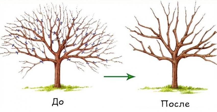 - Сначала удаляют все ветки, которые мешают развиваться остальным побегам. Оставляют только скелетные ветви, формирующие крону.