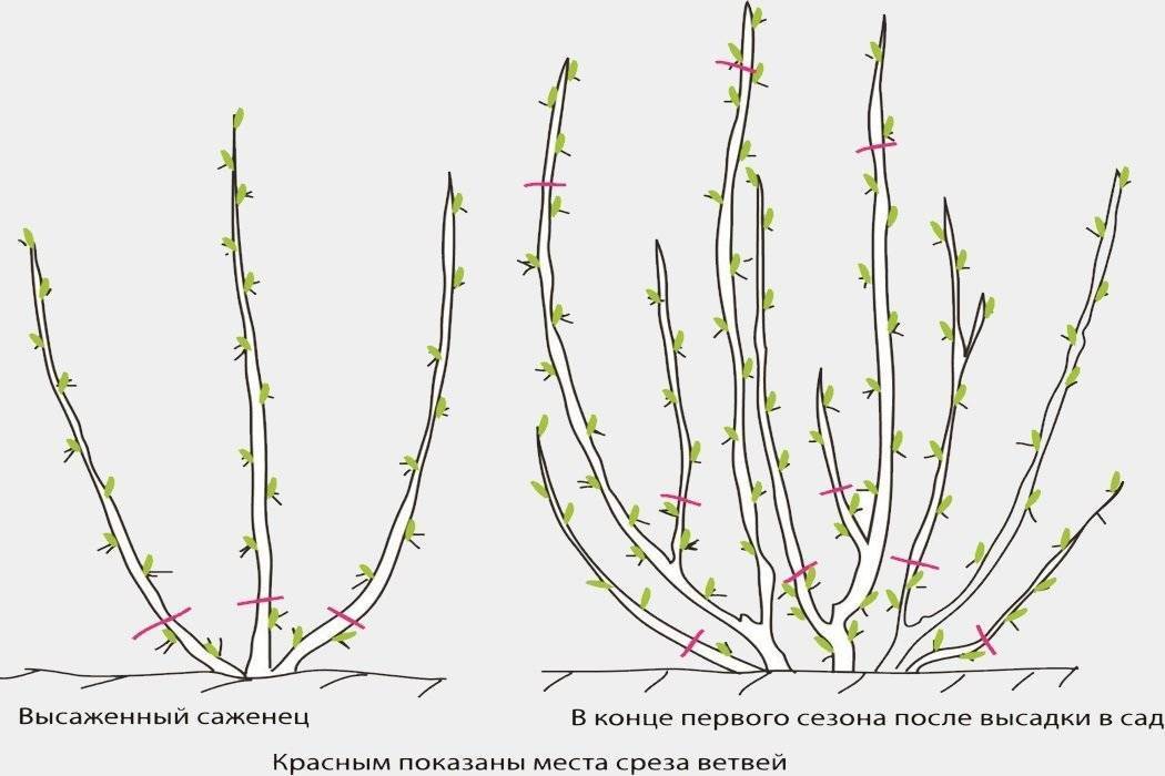 - На первом году жизни на побегах текущего года оставляют 4–5 почек и выбирают 3–4 сильных нулевых побега. Ветви растущие горизонтально, направленные внутрь куста и больные удаляют.