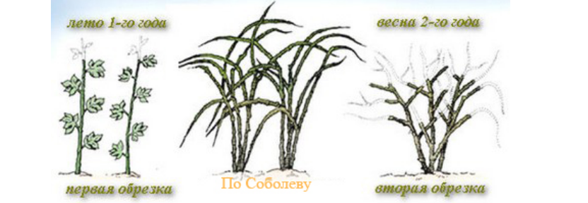 Современные садоводы часто применяют способ обрезки малины по Соболеву — основоположника малиноводства. Он советует срезать отростки на кустах по методу двоичной обрезки — первый год весной или в начале лета и во второй год также в весенний период.