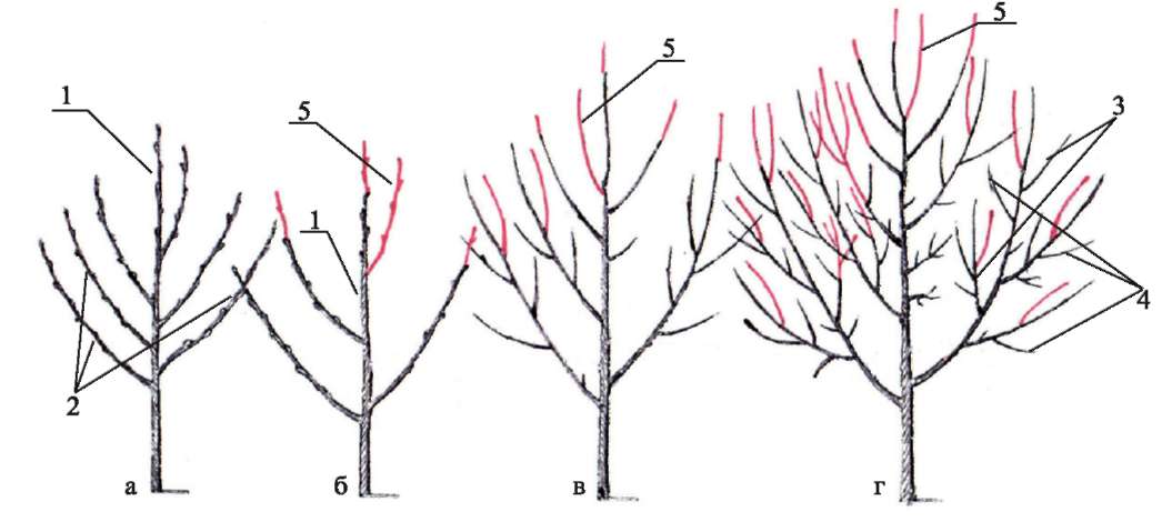 - Если высота ствола превысила 3,5 м, его рост рекомендуется угнетать, переводя основной проводник и скелетные побеги на ответвления, растущие вбок.