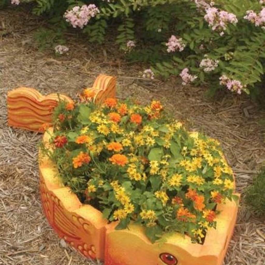 Вырезать цветок или лебедя. Можно и любое другое животное – главное, найти в интернете трафарет и перерисовать его на колесо. После останется вырезать, раскрасить и засадить.
