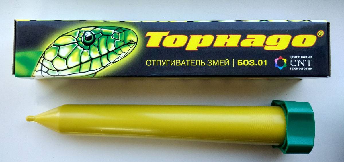 - Отпугиватель «Торнадо БОЗ.01» работает от батареек и имеет площадь воздействия чуть более 200 метров. Эффективен ещё и против кротов. Плюс модели заключается в сменном режиме вырабатывающихся частотных волн. Сила частоты сигнала усиливается через каждые 15-20 минут, что не вызывает привыкания у змей.